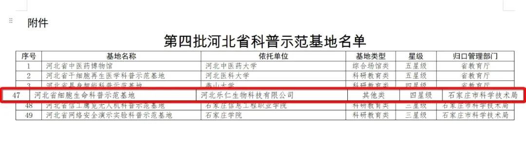 近日,河北省科學(xué)技術(shù)廳發(fā)布關(guān)于第四批省級(jí)科普示范基地的公示,河北樂仁生物科技有限公司獲評(píng)河北省細(xì)胞生命科普示范基地(四星級(jí))。