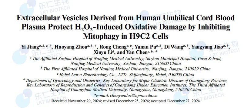 樂仁生物蔣毅博士發表SCI文章:闡明人臍血外泌體通過抑制線粒體自噬減少心肌細胞氧化損傷機制,為臍血外泌體抗氧化提供理論依據