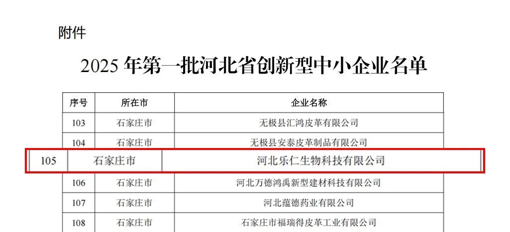 近日,河北省工業和信息化廳發文公布,2025年第一批河北省創新型中小企業名單,河北樂仁生物科技有限公司榜上有名!